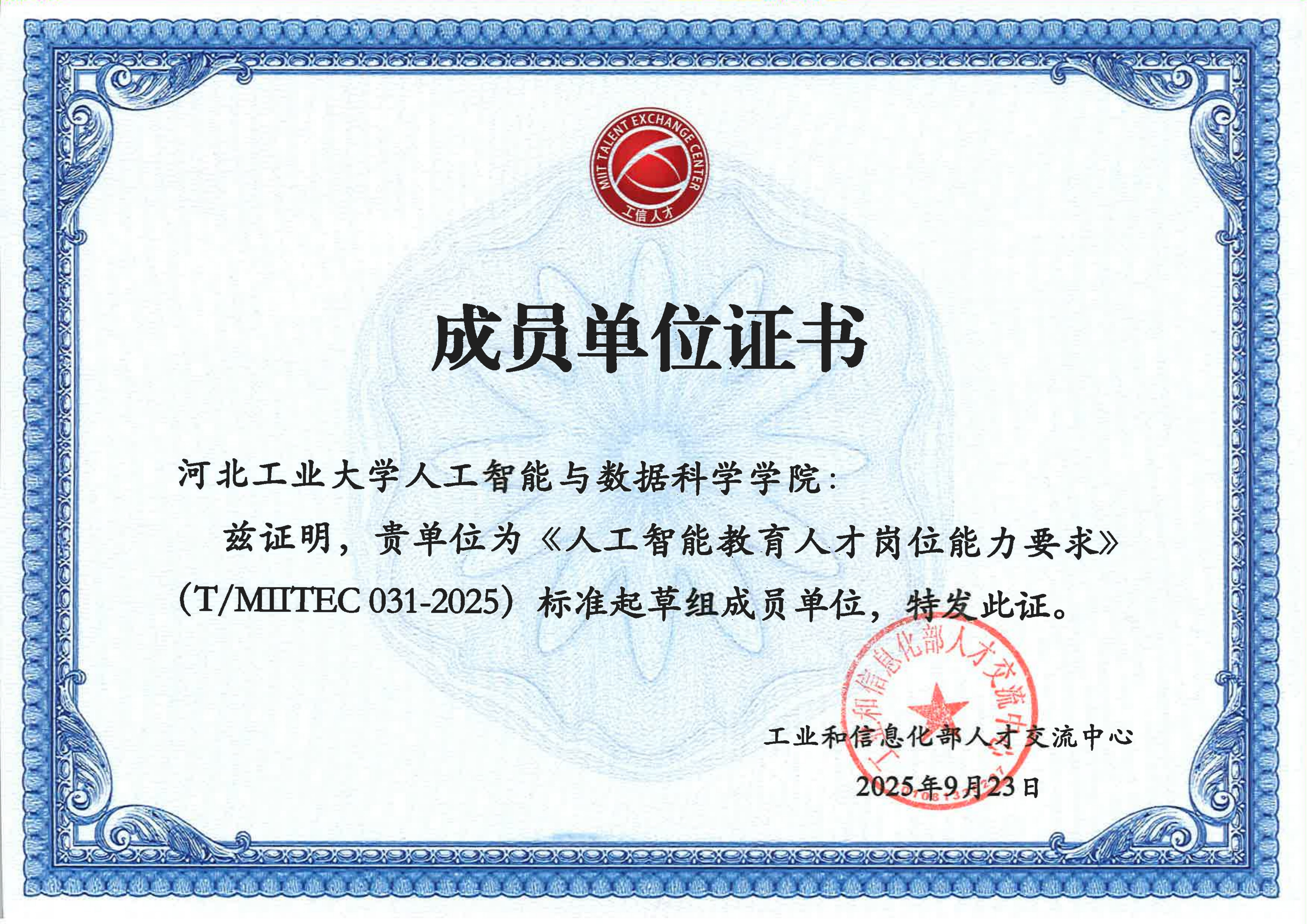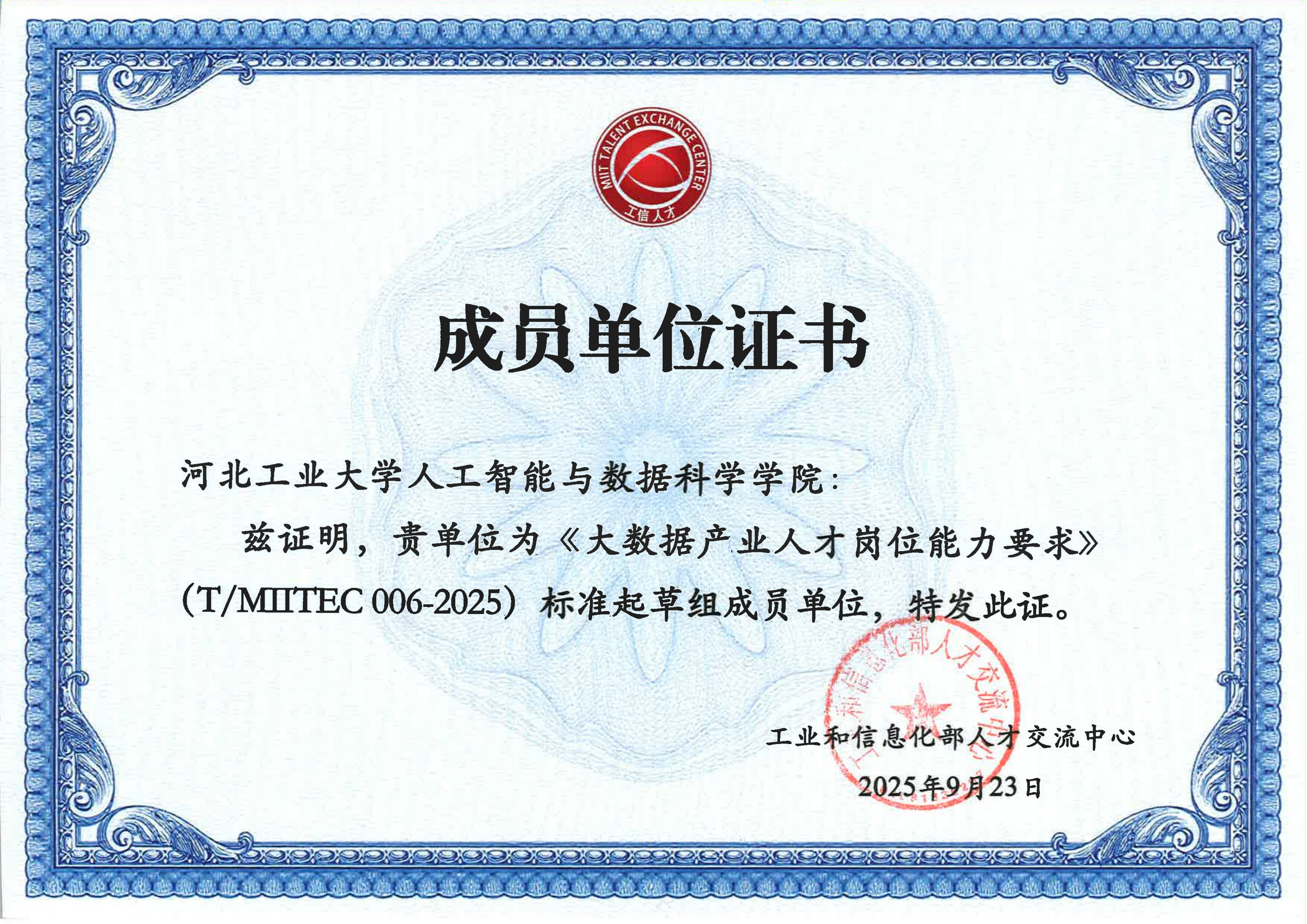 近日,熟女 收到工业和信息化部人才交流中心颁发的两份证书,标志着熟女 成功入选《人工智能教育人才岗位能力要求》(T/MITEC031-2025)与《大数据产业人才岗位能力要求》(T/MITEC 06-2025)两项工信部人才标准的起草组成员单位。刘晶研究员团队深度参与了这两项标准的前期调研、框架设计及核心内容研讨,为标准的科学性与实用性构建提供了重要支持。